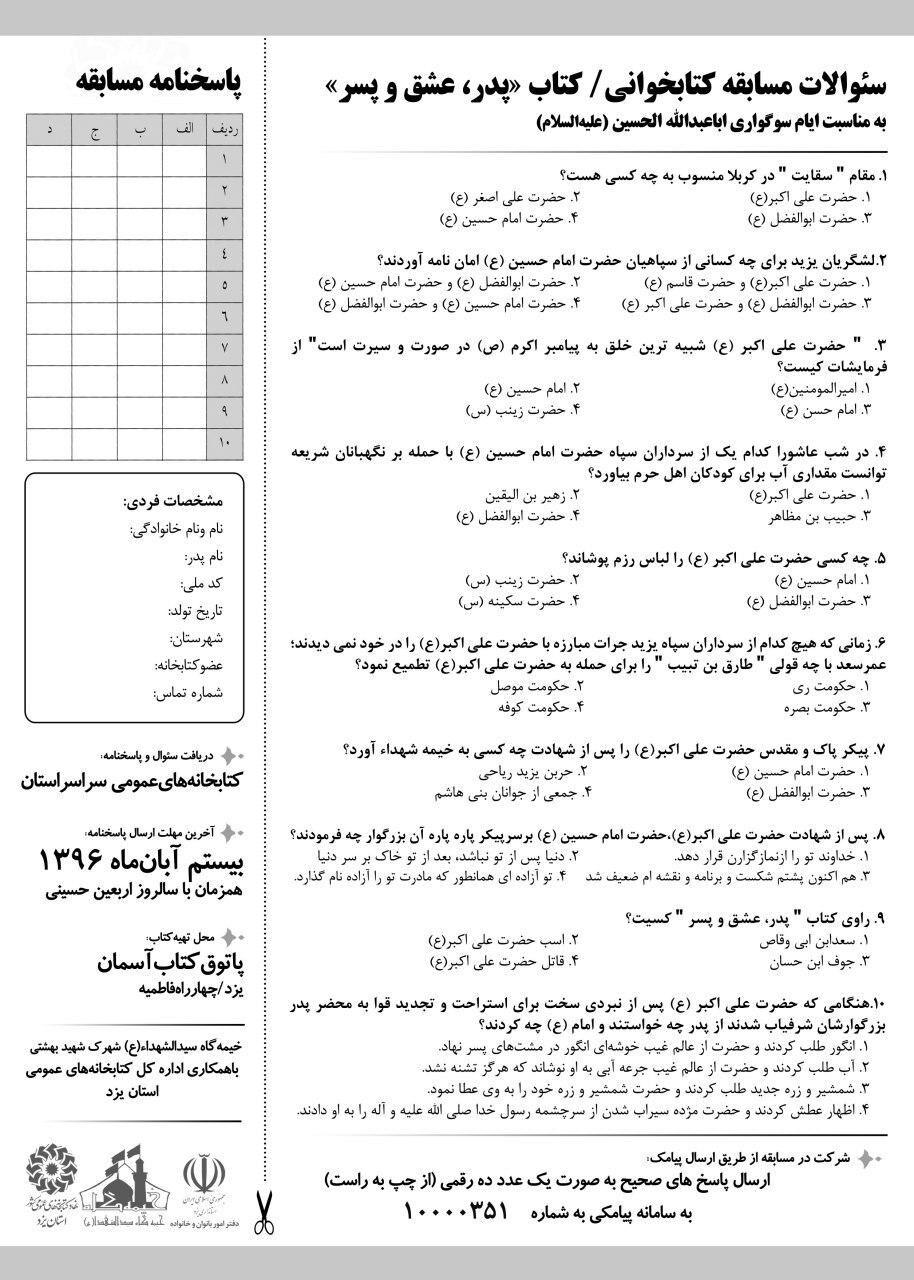 به مناسبت ایام محرم و صفر و همزمان با هفته کتاب، اداره کل کتابخانه های عمومی استان یزد با همکاری خیمه گاه سیدالشهدا(ع) مسابقه بزرگ کتابخوانی عاشورایی را در سراسر استان برگزار می کند. علاقه مندان به شرکت در این مسابقه تا بیستم آبان ماه مهلت دارند تا به صورت مکتوب، آنلاین و پیامکی در این مسابقه شرکت کنند.